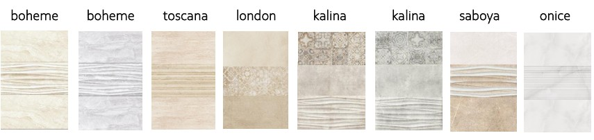 A 3 család 3 különböző felületet mutat be. A Barbados kőhatású, a Linea márvány erezetes, a Terrane pedig a travertin kő mintázatát követi.