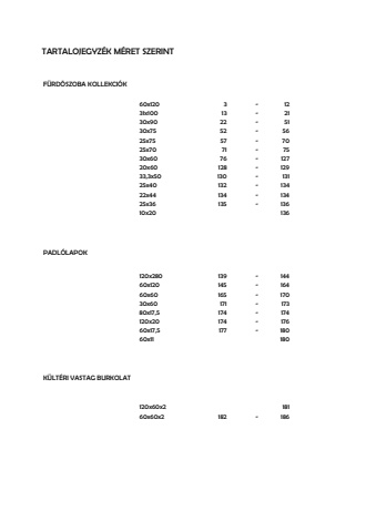 TARTALOJEGYZ%u00c9K M%u00c9RET SZERINTPADL%u00d3LAPOKK%u00dcLT%u00c9RI VASTAG BURKOLATF%u00dcRD%u00d5SZOBA KOLLEKCI%u00d3K60x1203-1231x10013-2130x90%u00a022-5130x7552-5625x7557-7025x70%u00a071-7530x6076-12720x60128-12933,3x50130-13125x40132-13422x44134-13425x36135-13610x20136120x280139-14460x120145-16460x60165-17030x60171-17380x17,5174-174120x20174-17660x17,5177-18060x11180120x60x218160x60x2182-186