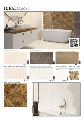 IDEAL30x60 cmPALAZZO CREMA 30X6021,44 mIDEAL WOOD NATU L MAT 30X6021,44 mIDEAL CREMA STRUKTU POLYSK 30X6021,44 mIDEAL PANEL SZKLANA 60X60PALAZZO BROWN 30X6021,44 mIDEAL WHITE STRUKTU MAT 30X6021,44 mHEKSAGON WHITE STRUKTU POLYSK 17,1X19,8WOOD NATU L MIX HEKSAGON MOZAIK 22X25,520,66 m
